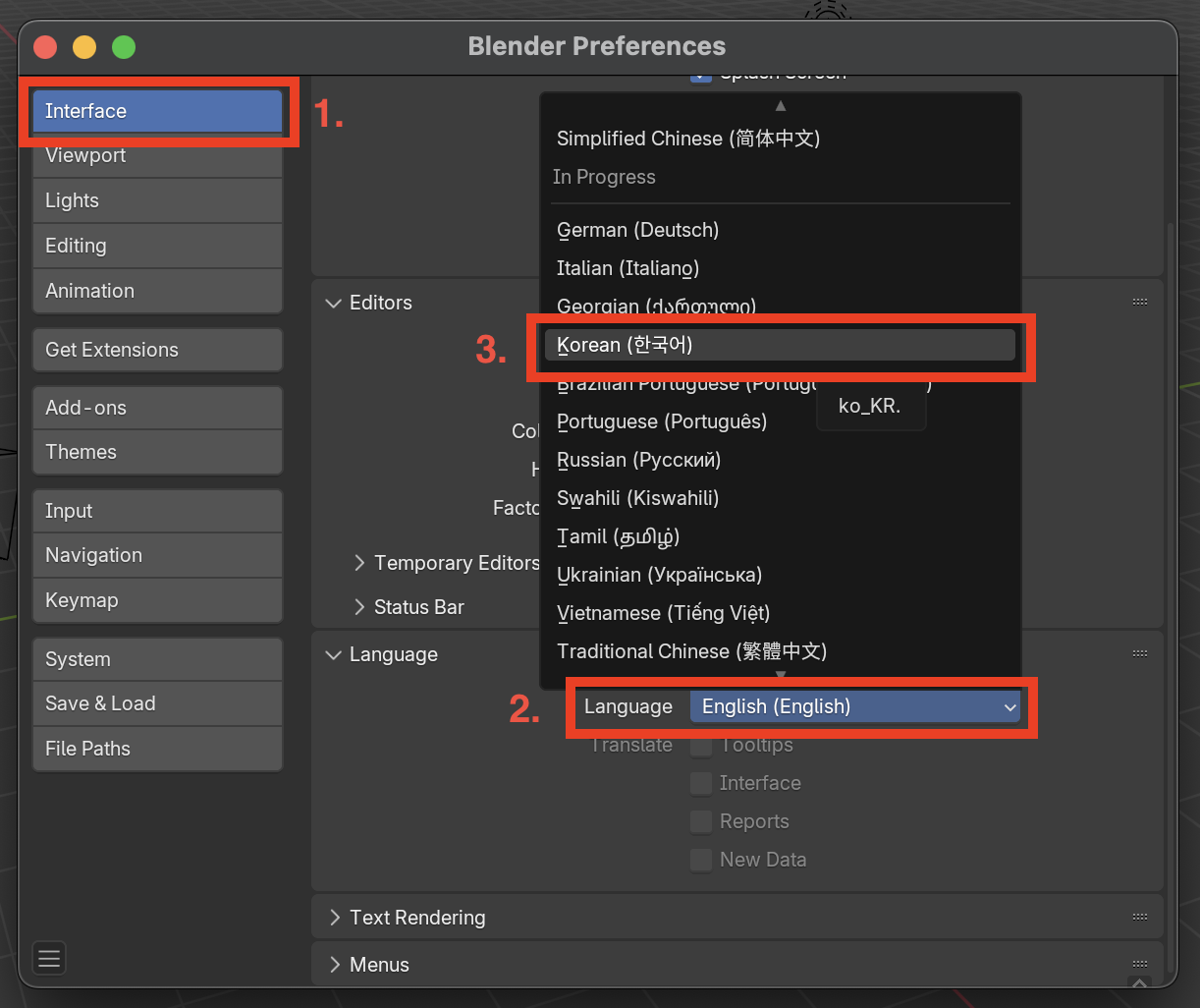블렌더의 생태계는 이미 영어를 기본 언어로 두고 사용하는 사람이 훨씬 많습니다. 많은 강좌와 매뉴얼뿐만 아니라, 회사와 같이 팀으로 일할 때에도 모두들 블렌더 내의 기능들을 영어로 두고 사용하며 소통할 것입니다. 이런 점은 블렌더뿐만 아니라 수많은 전문 프로그램들도 마찬가지입니다.