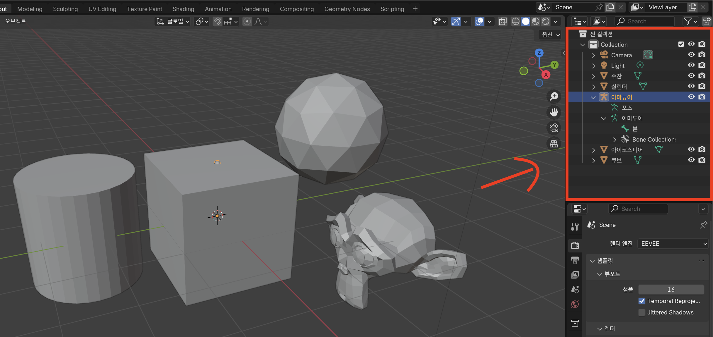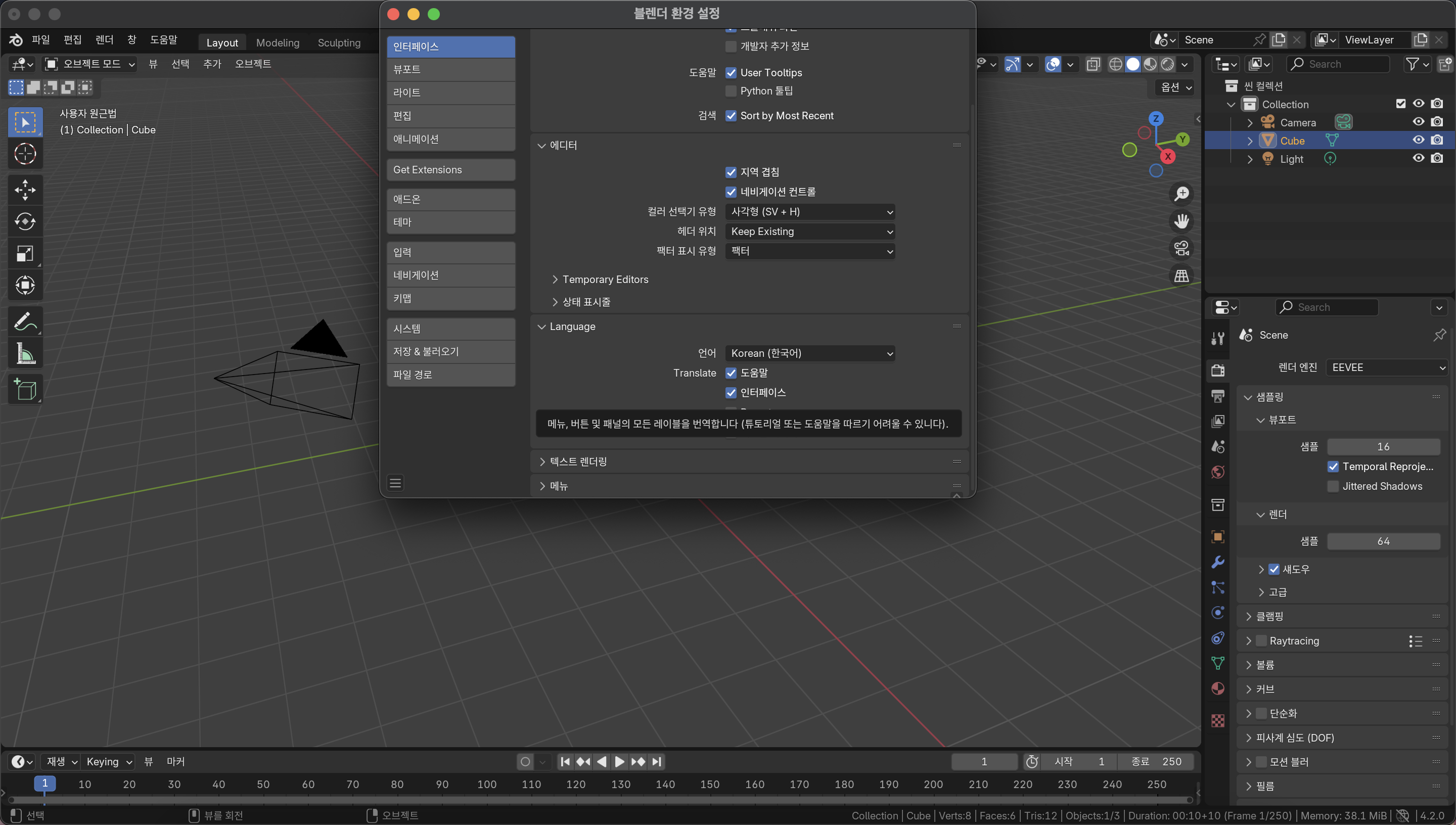 이런 문제로 인해 명칭에는 한글이 아닌 영문으로 작성하시는 것을 적극 권장합니다. 하지만 블렌더의 한국어 설정을 그대로 적용하게 되면, 블렌더는 앞으로 만들어지는 모든 물체에 대해 자동으로 한글로 된 이름이 붙여버릴 겁니다.