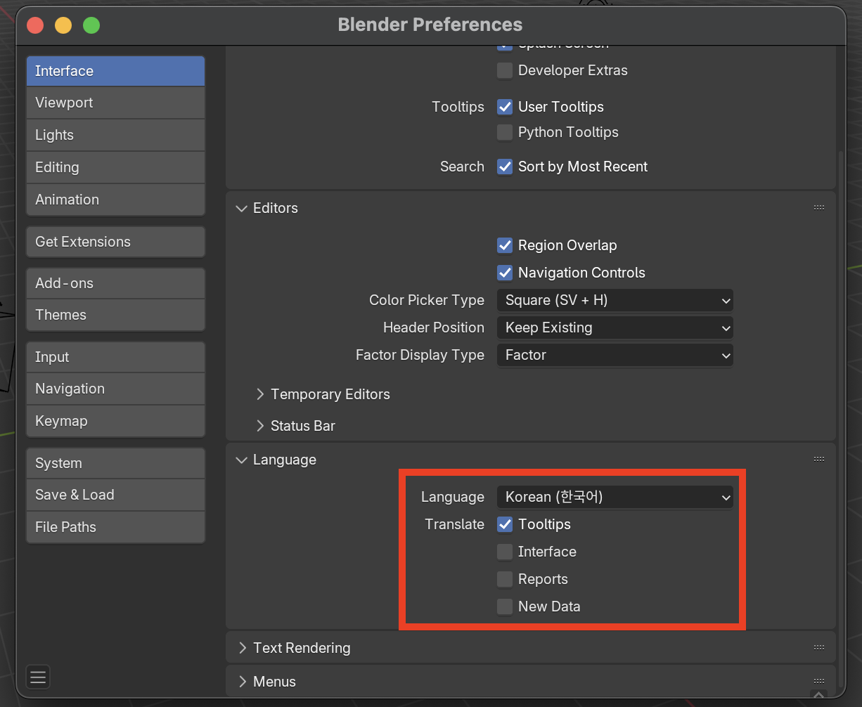 - 블렌더 한글 설정은 득 보다 실이 많다. 전체 한글 적용은 하지 말 것.